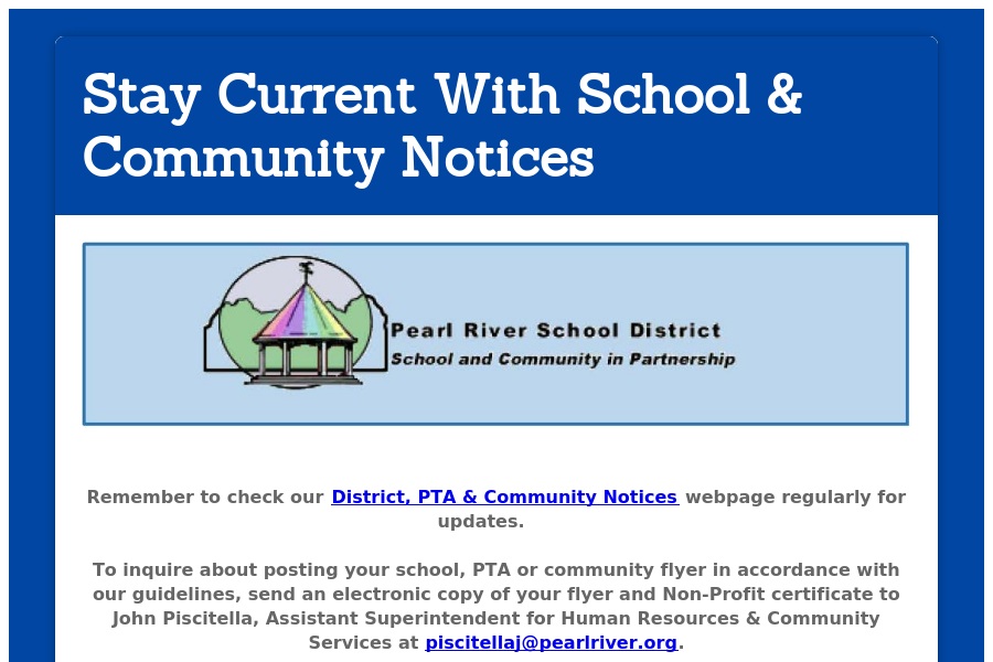 Stay Current With School & Community Notices Remember to checkour District, PTA & Community Notices webpageregularly for updates. To inquire about posting you. . .