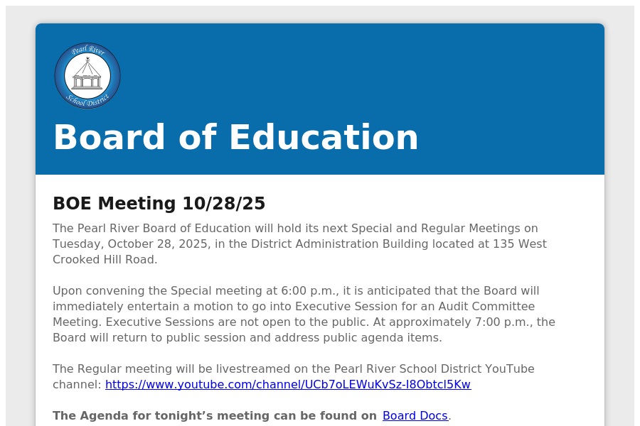 Board of Education BOE Meeting 10/28/25 The Pearl River Board of Education will hold itsnext Special and Regular Meetings on Tuesday, October 28, 2025, in the District Administratio. . .